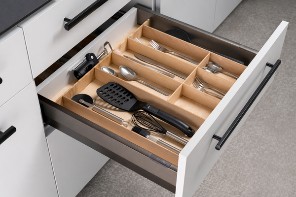 Sistema Matrix Box, Cajones de doble pared con guías sincronizadas y cierre suave (Soft-Close) para una estabilidad perfecta.